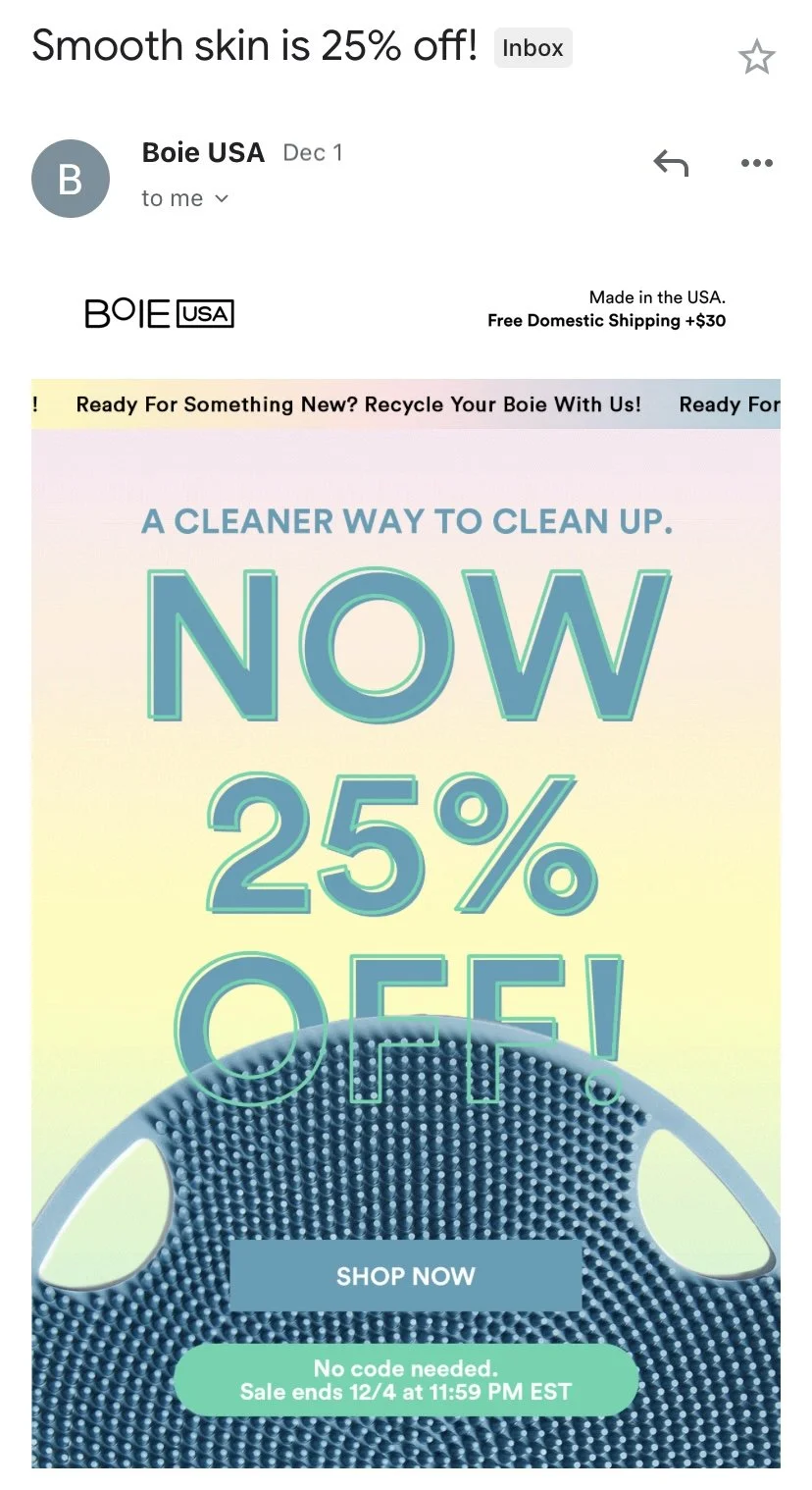 I manage all email marketing for personal care brand Boie USA. Managing a team of designers and coders, I direct the content calendar, write the copy, and review analytics. Together we have grown our engaged email list year over year—over 50% from 125K to 450K.